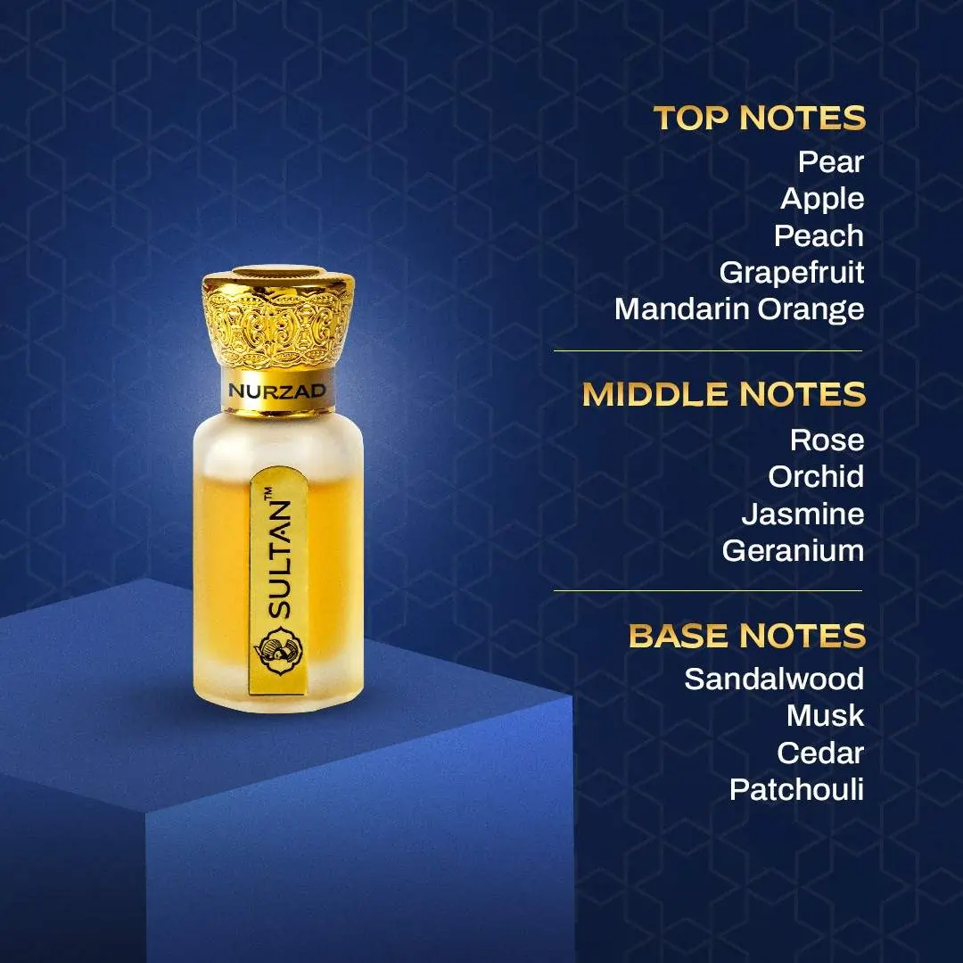 Nurzad opens with a refreshing burst of pear, apple, peach, zesty grapefruit, and mandarin orange, creating a vibrant and uplifting start. As it settles, a luxurious floral heart of rose, orchid, jasmine, and geranium unfolds, adding depth and sophistication. The fragrance finishes with a warm and lasting base of sandalwood, musk, cedar, and patchouli, making it a perfect choice for both day and evening wear.